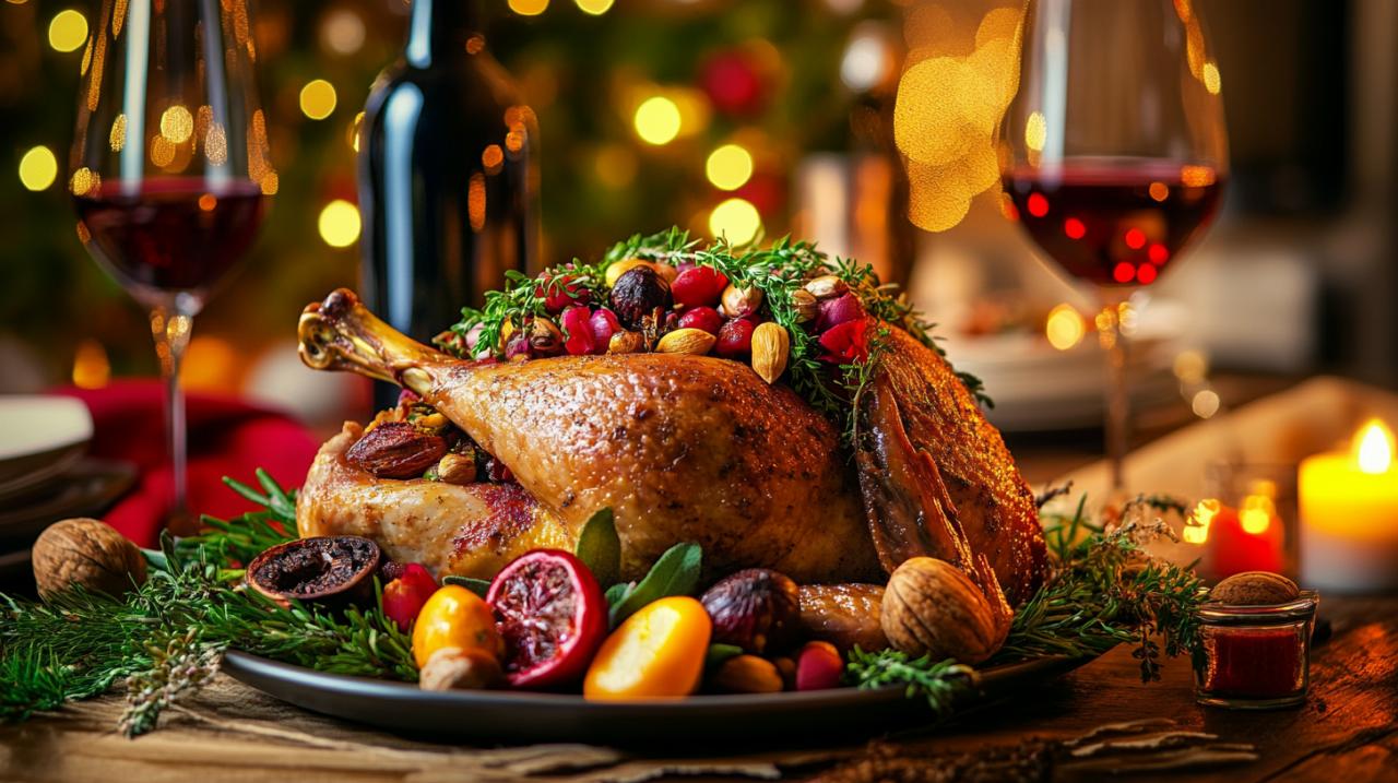 En matière d'accords vins, privilégiez un Bourgogne rouge aux tanins soyeux comme un Pinot Noir, un Montlouis-sur-Loire pour ceux qui préfèrent les vins blancs structurés, ou encore un Alsace Pinot Noir qui accompagnera délicatement ce plat festif. Ces vins ont la particularité de ne pas dominer les saveurs subtiles de la farce aux marrons tout en apportant la structure nécessaire pour équilibrer la richesse de la volaille. Avec une difficulté moyenne, un temps de préparation d'environ 20 minutes et une cuisson totale de 3 heures 25 minutes pour une dinde entière, cette recette de fêtes reste accessible et garantit un résultat impressionnant qui justifie pleinement son statut de plat principal incontournable des célébrations de Noël et autres occasions festives.