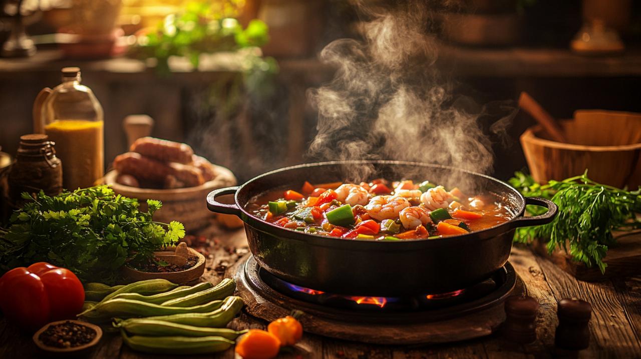 Techniques ancestrales de cuisson et assemblage du gumbo authentique
